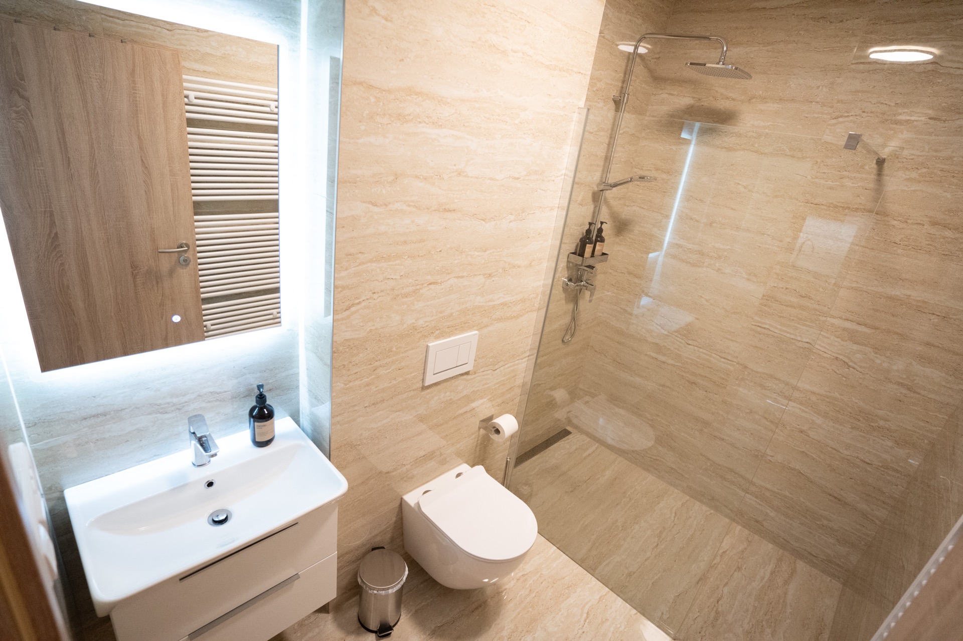 Koupelna je kompaktní a funkční – přesně podle filozofie celého apartmánu. Je zde sprchový kout a umyvadlo. Nechybí zde ani zrcadlo s LED osvětlením. Čisté ručníky, fén a přírodní kosmetika značky Meraki – šampon, sprchový gel a mýdlo jsou vám k dispozici jako bonus. Pro případ potřeby je zde i "nouzový šuplík" s toaletním papírem.