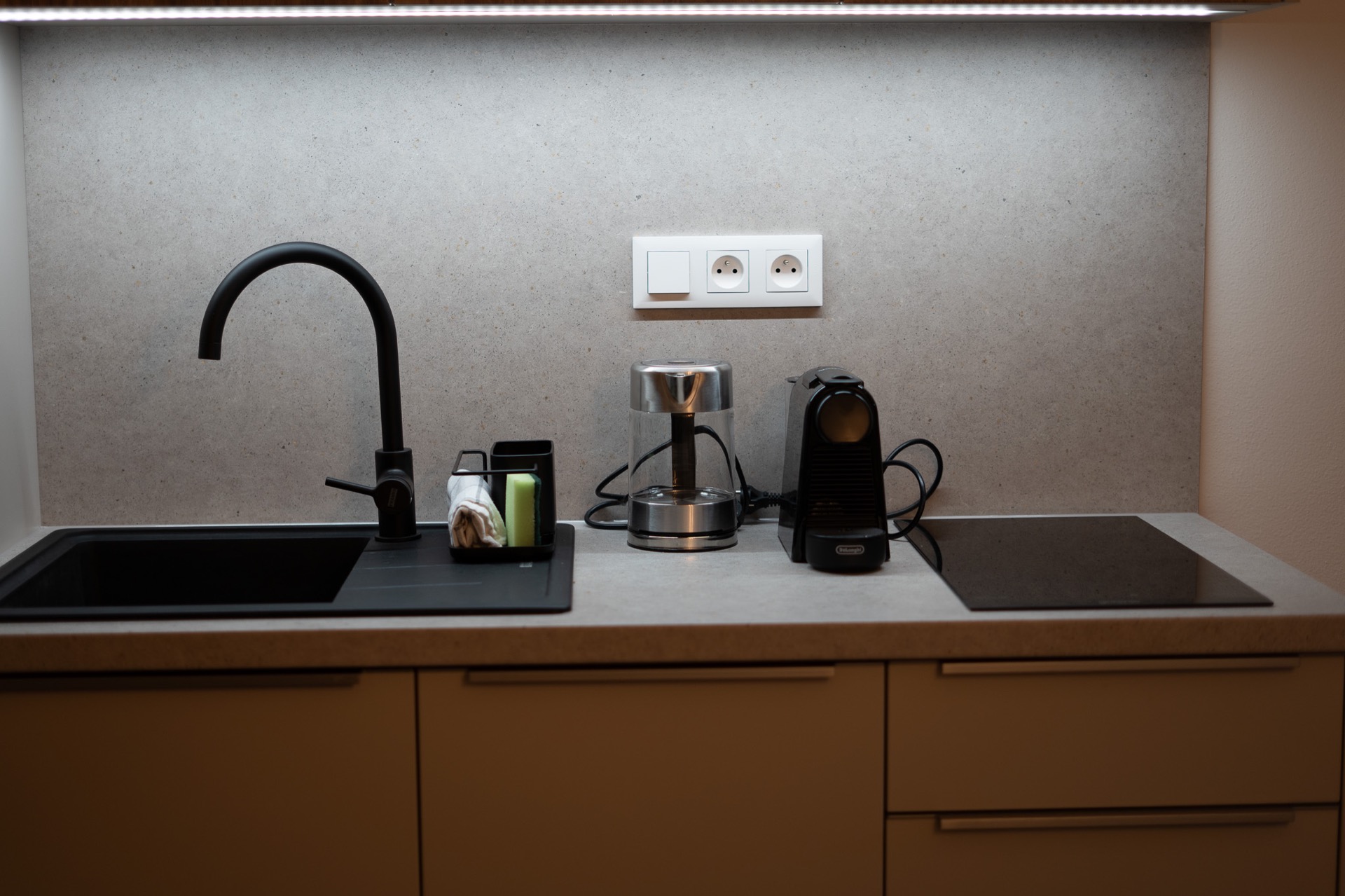 Kuchyně je plně vybavená vším, co potřebujete, včetně lednice, indukčního sporáku, mikrovlnky a rychlovarné konvice. Na ranní kávu zde najdete kávovar s kapslemi, a pokud jste fanoušky čaje, máte k dispozici jak sypané, tak sáčkové čaje. Nechybí samozřejmě ani kompletní sada nádobí, hrnců, příborů a keramická pánev pro zdravé vaření. Sůl, pepř a cukr se tady taky najde, abyste si mohli připravit cokoliv od snídaně po večeři jako od babičky.